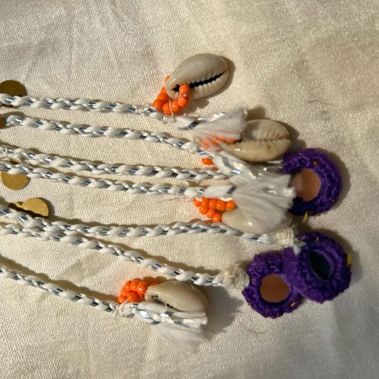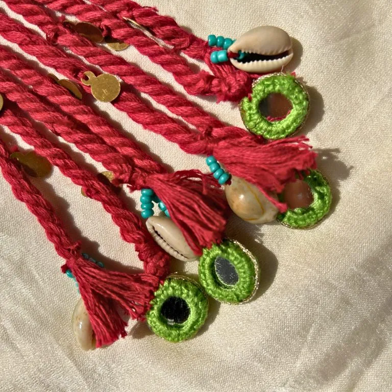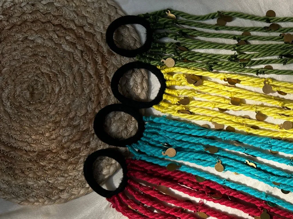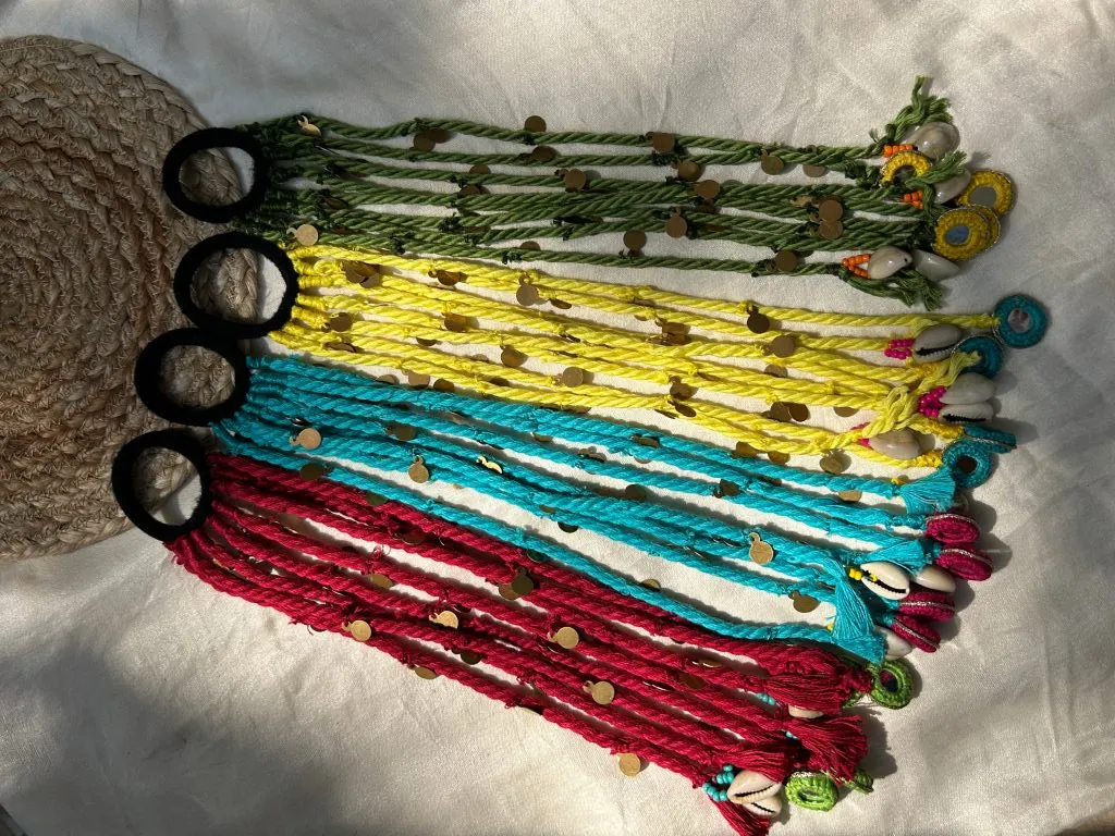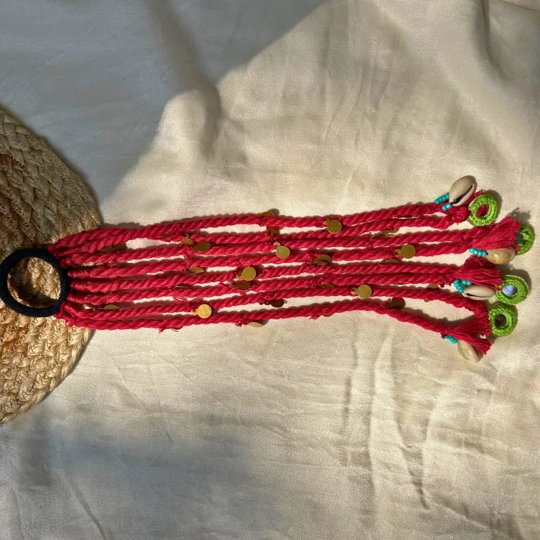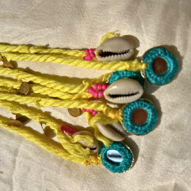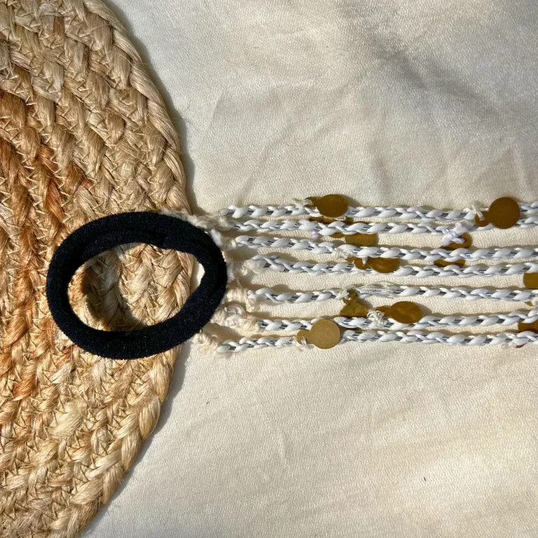 Handcrafted hair tie featuring twisted yarn strands embellished with metallic accents and cowrie-style charms, finished with looped ends for a secure and stylish boho look.