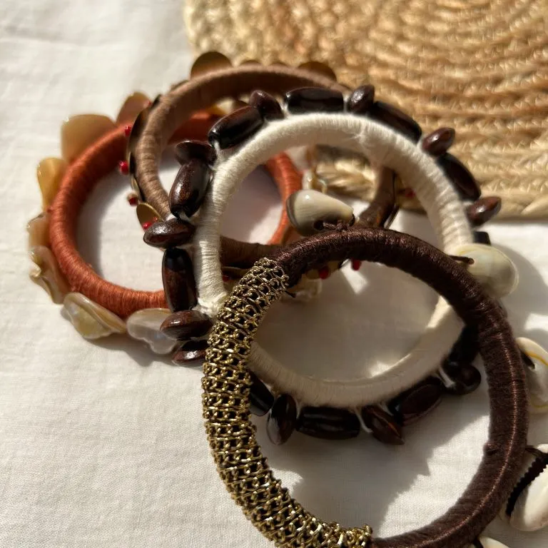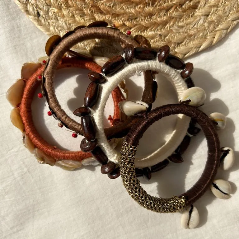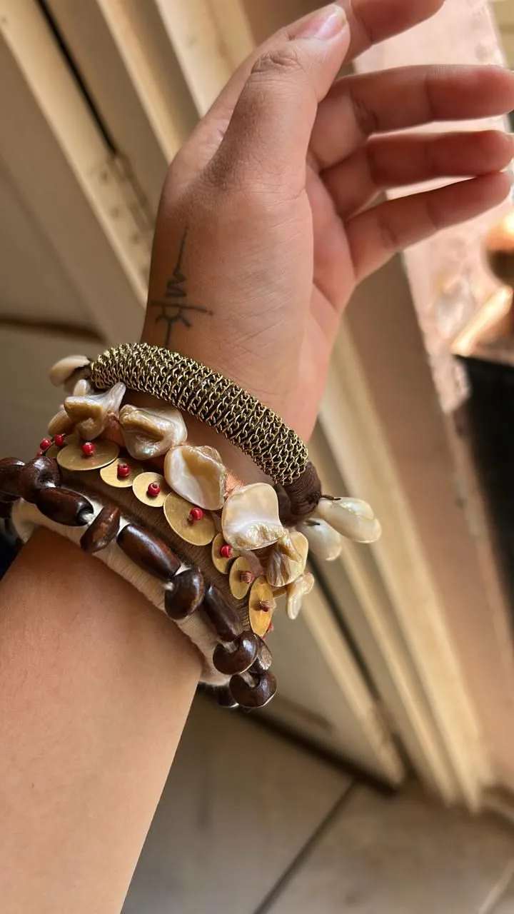 A raw blend of wood, shell, and antique brass — handcrafted for the free-spirited soul. The Nomad Hand Stack carries stories of earth, travel, and timeless craft.