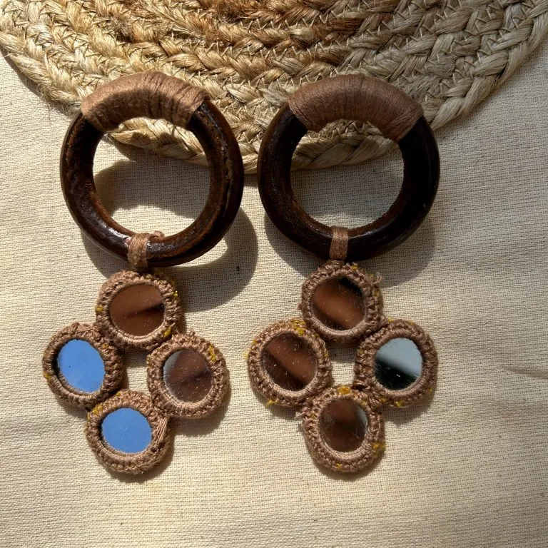 Handcrafted statement earrings featuring wrapped wooden hoops and clustered mirror accents. Lightweight, artisanal, and perfect for adding a touch of ethnic charm to any look.