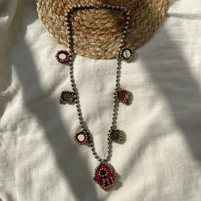 Handcrafted silver-tone necklace featuring mirror charms with bead detailing and a statement pendant perfect for boho and fusion looks