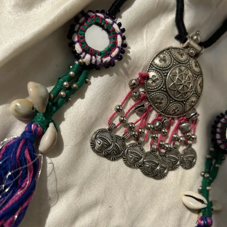 A handcrafted tribal-style adjustable necklace featuring mirror work, vibrant thread wrapping, cowrie shells, and antique silver charms. The central oxidised pendant with intricate motifs and dangling tribal coins adds a bold, earthy touch—perfect for boho, ethnic, and fusion looks.